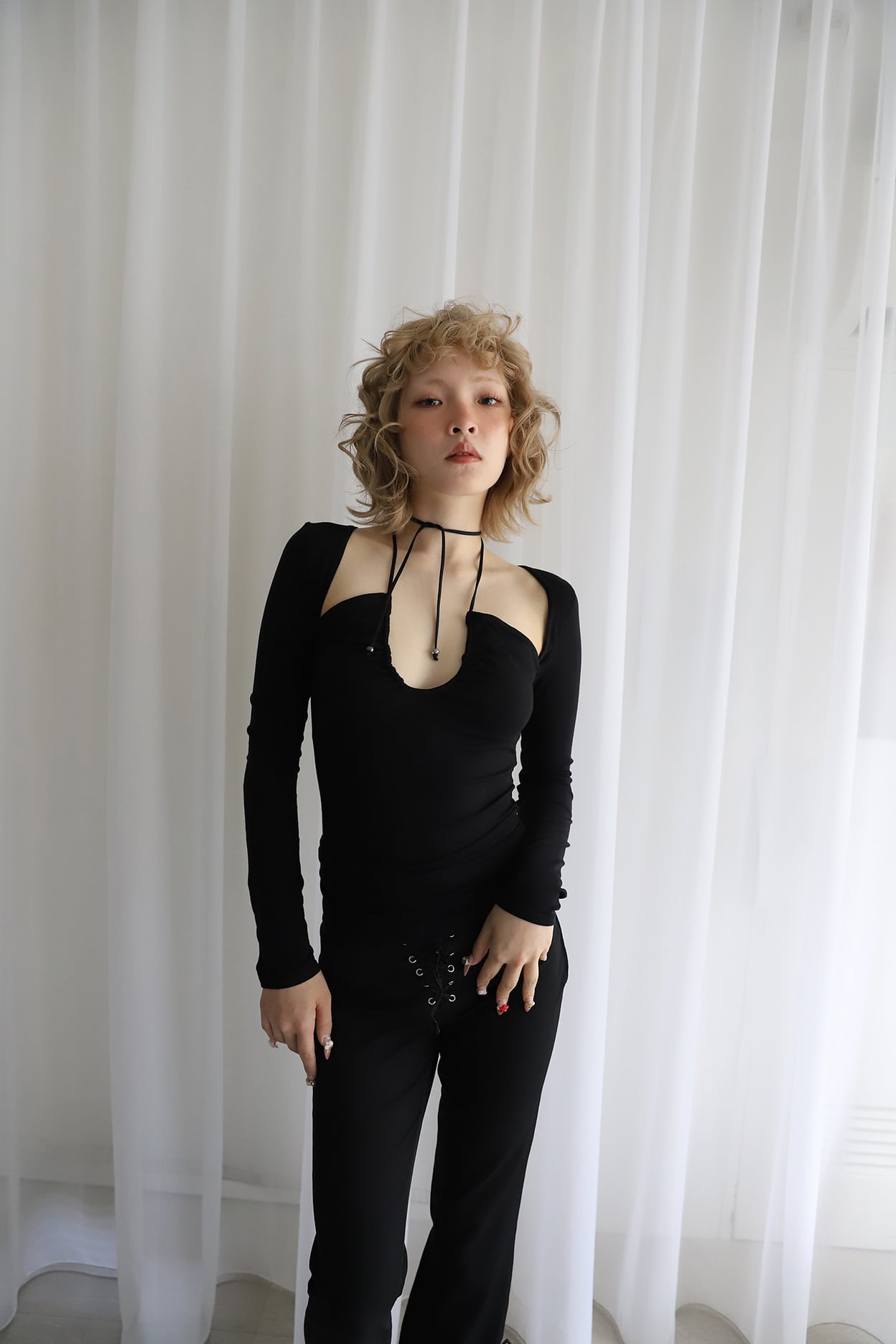 キャミソールに袖がついたようなスタイルのホルターネックトップス。