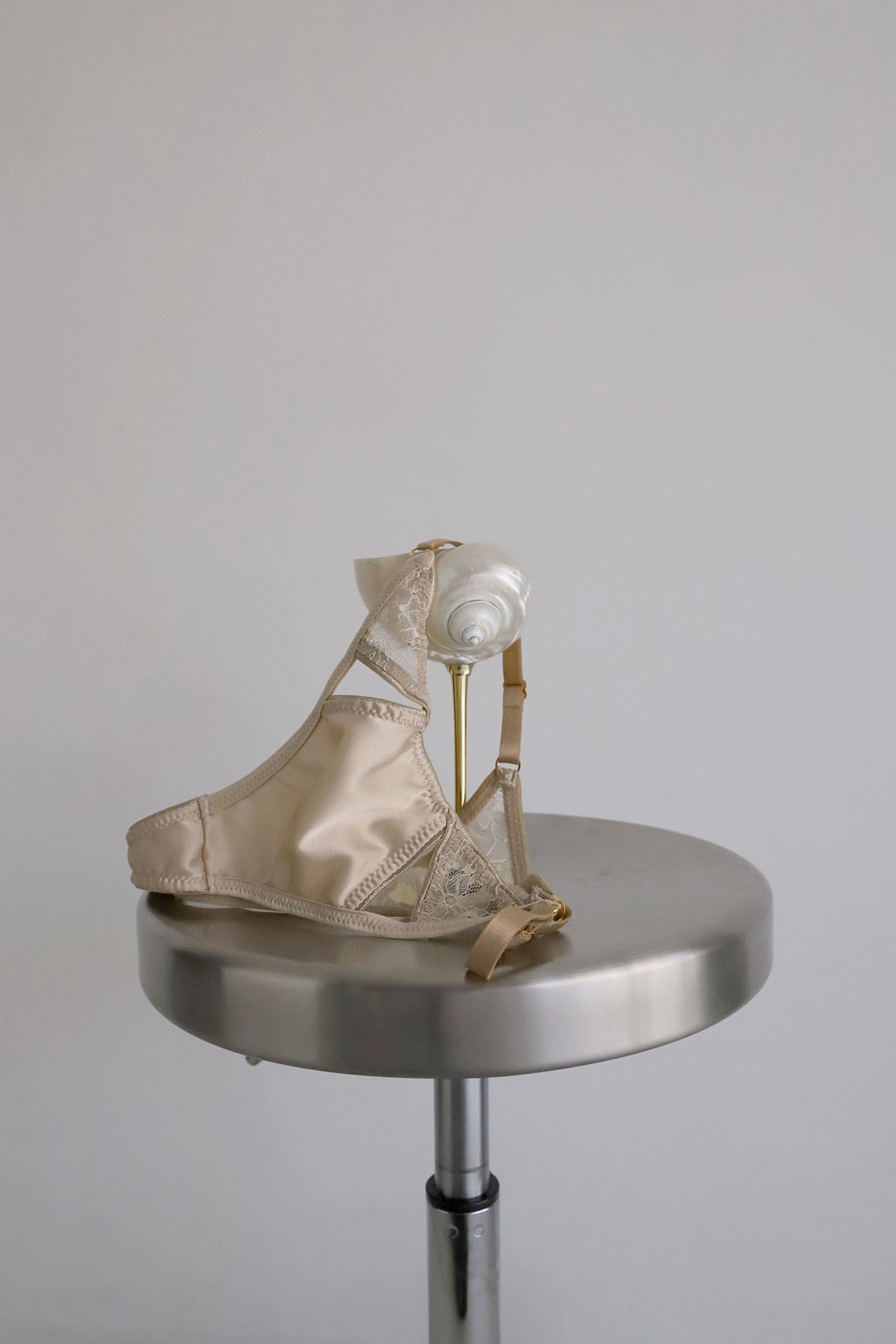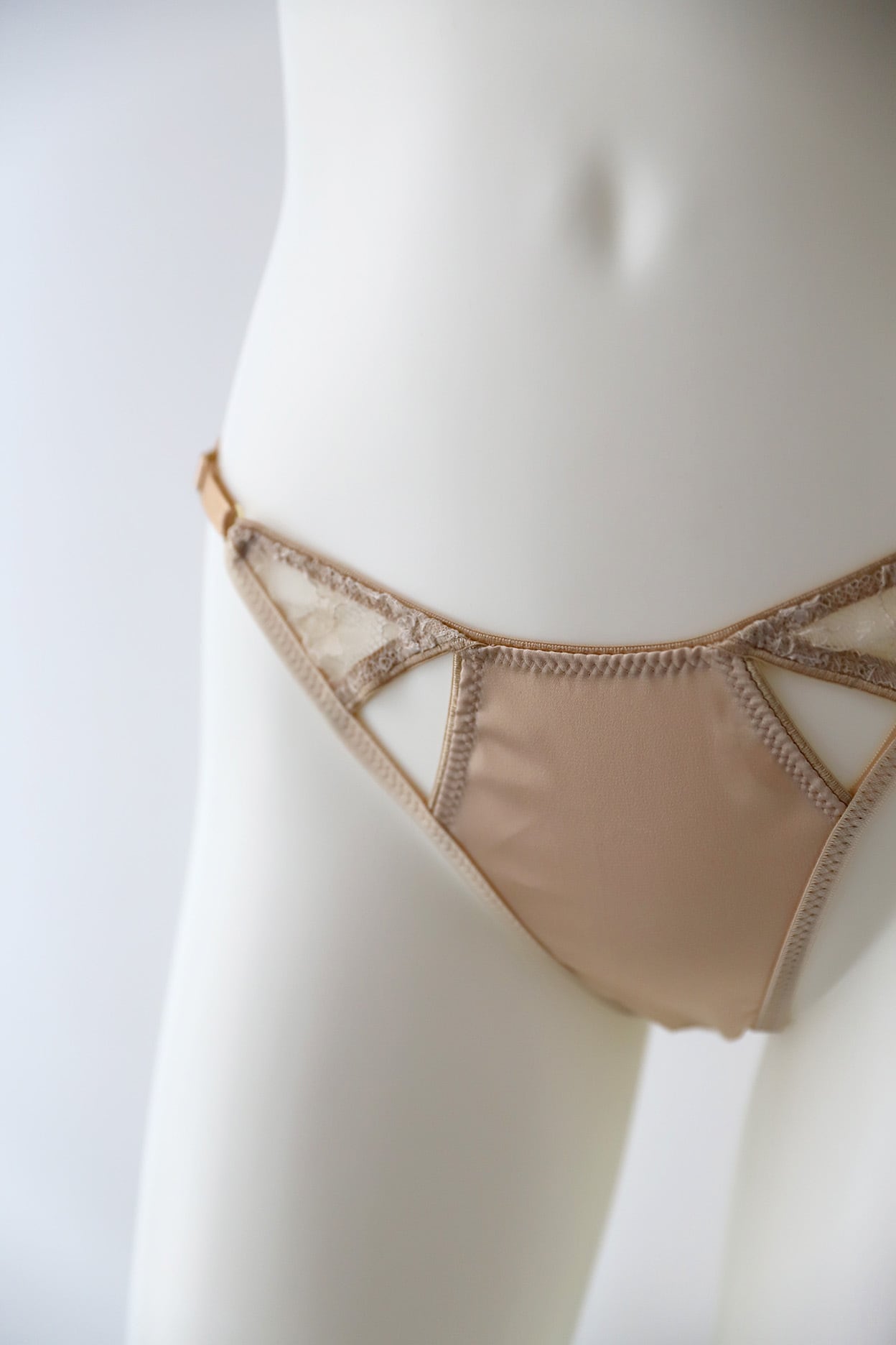サテンとレースの組み合わせ、ちらりと肌が見える、フロントデザインが最大のポイント。