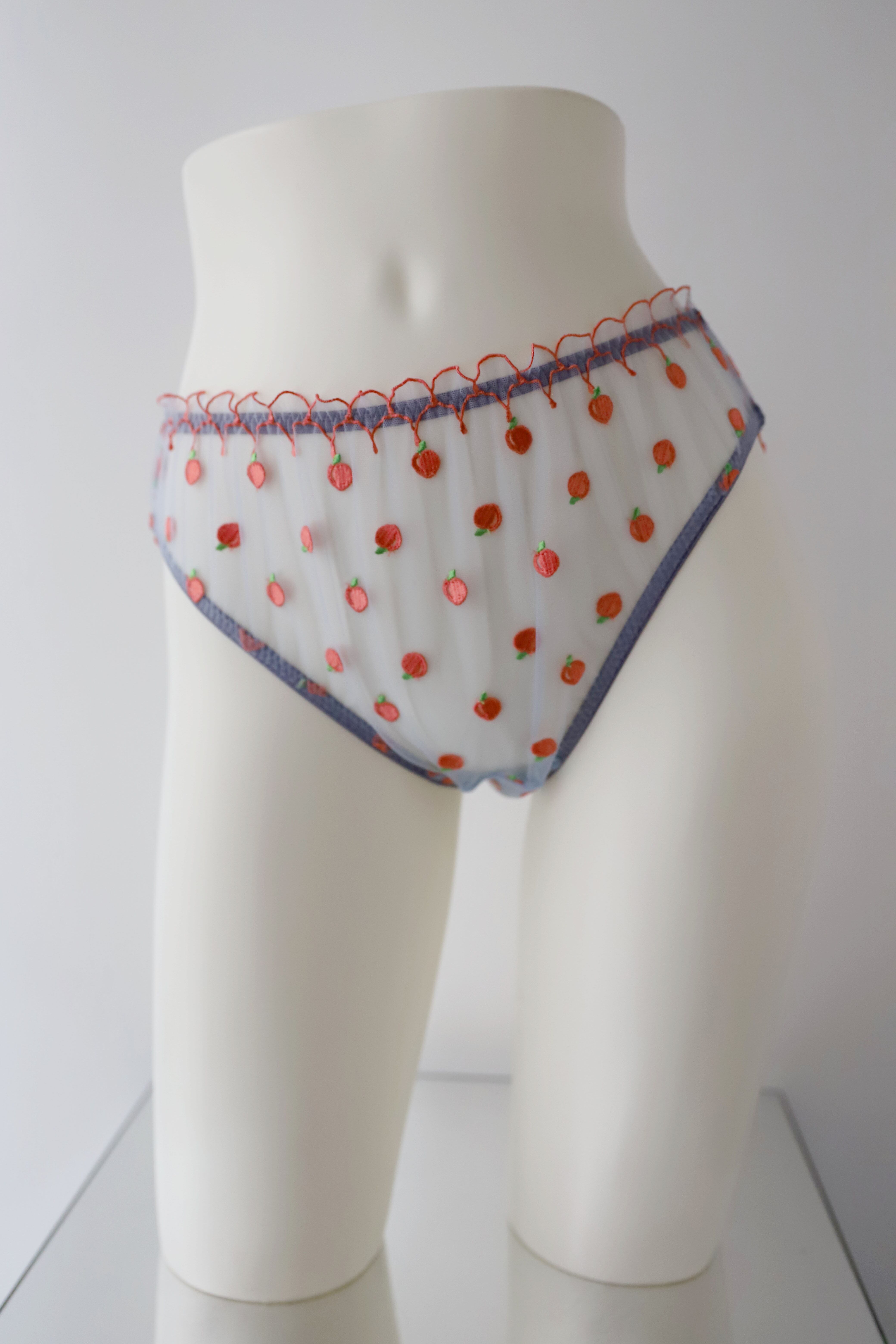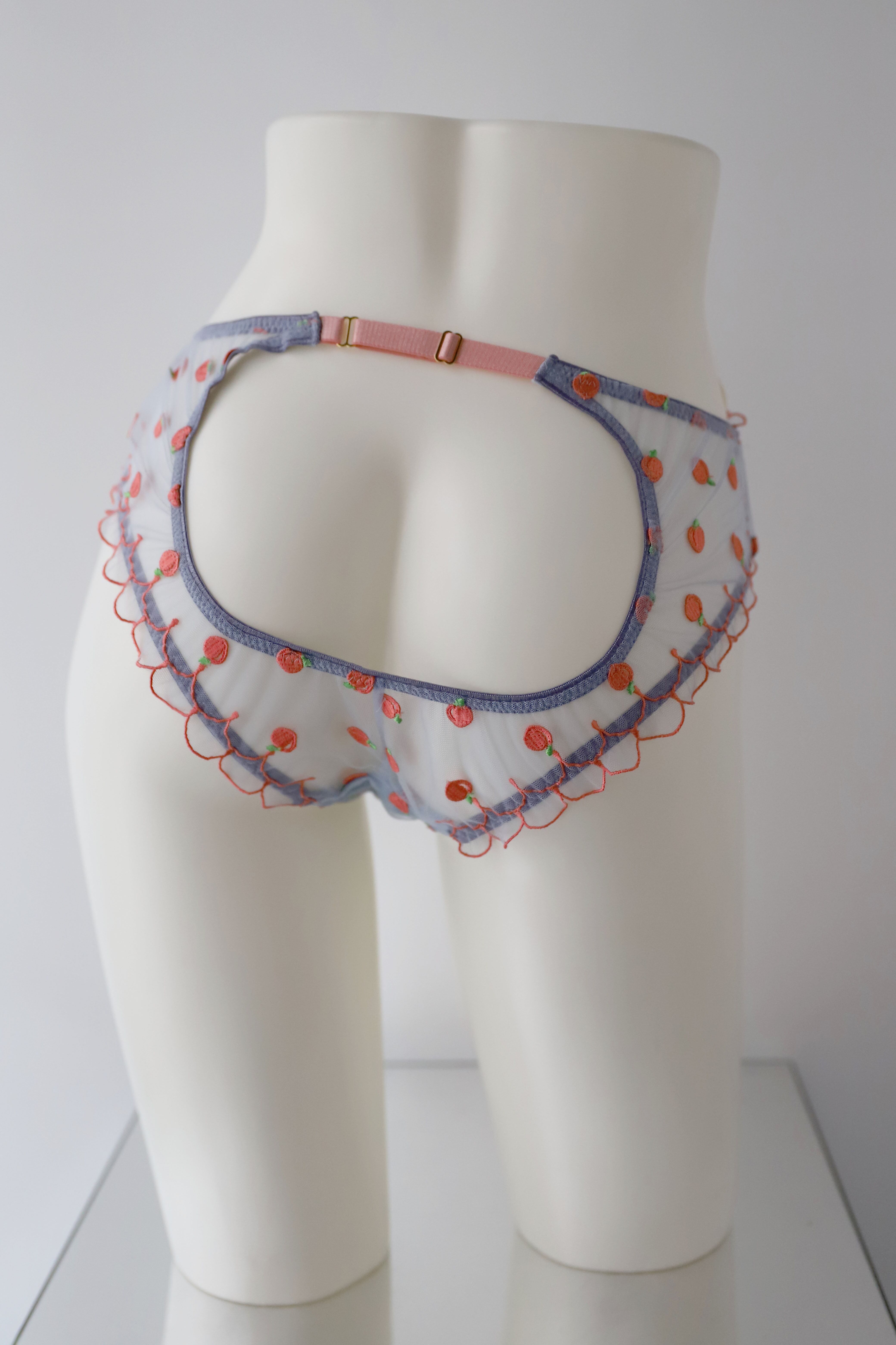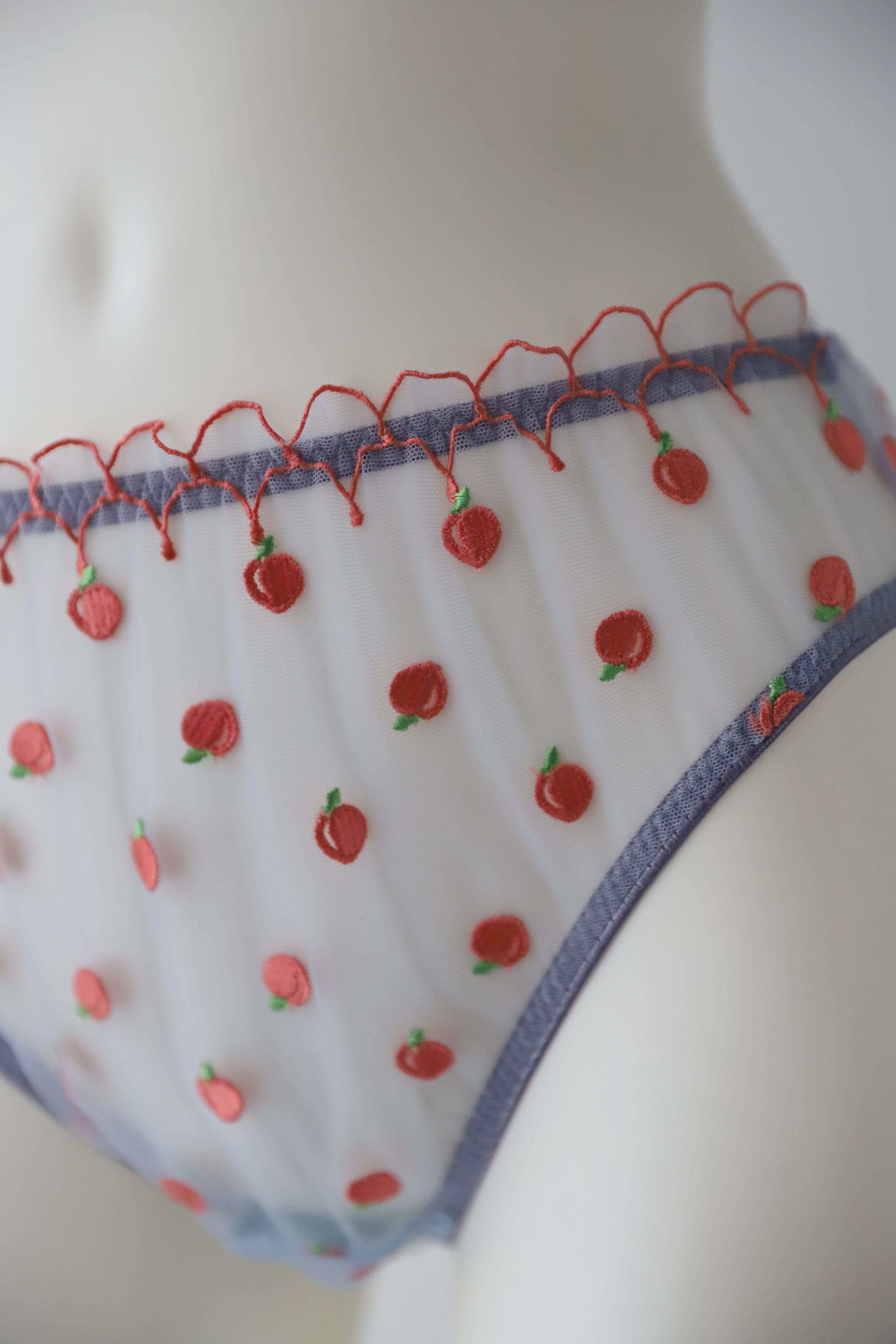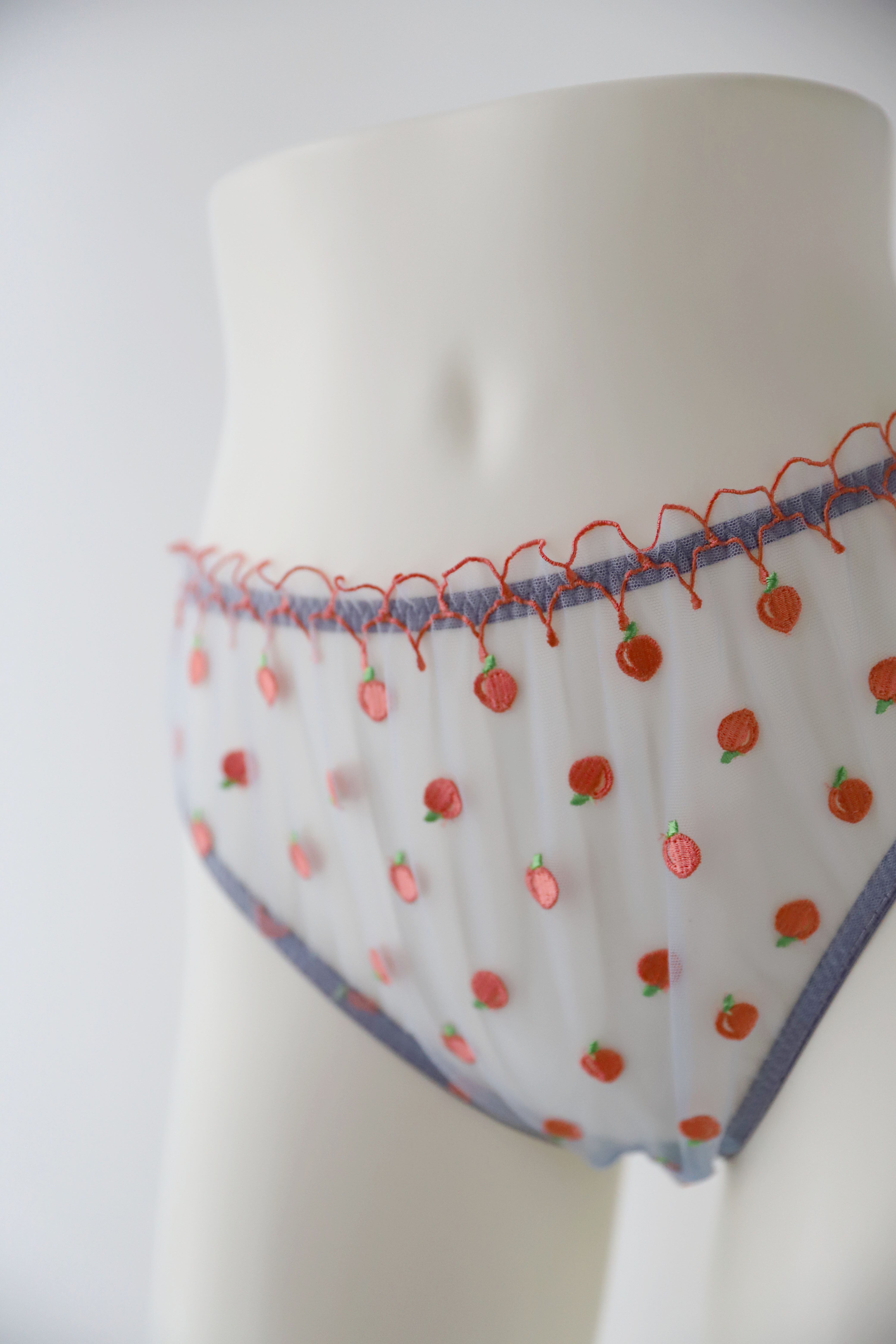 シアーな素材に珍しいPEACH柄の刺繍とフリルのデザインが
